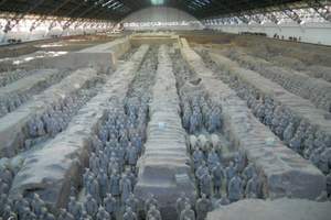 1974年,在秦始皇帝陵東發現三個大型陪葬的兵馬俑坑,并相繼進行發掘和建館保護。三個坑成品字形,總面積22780平方米,坑內置放與真人馬一般大小的陶俑陶馬共約
